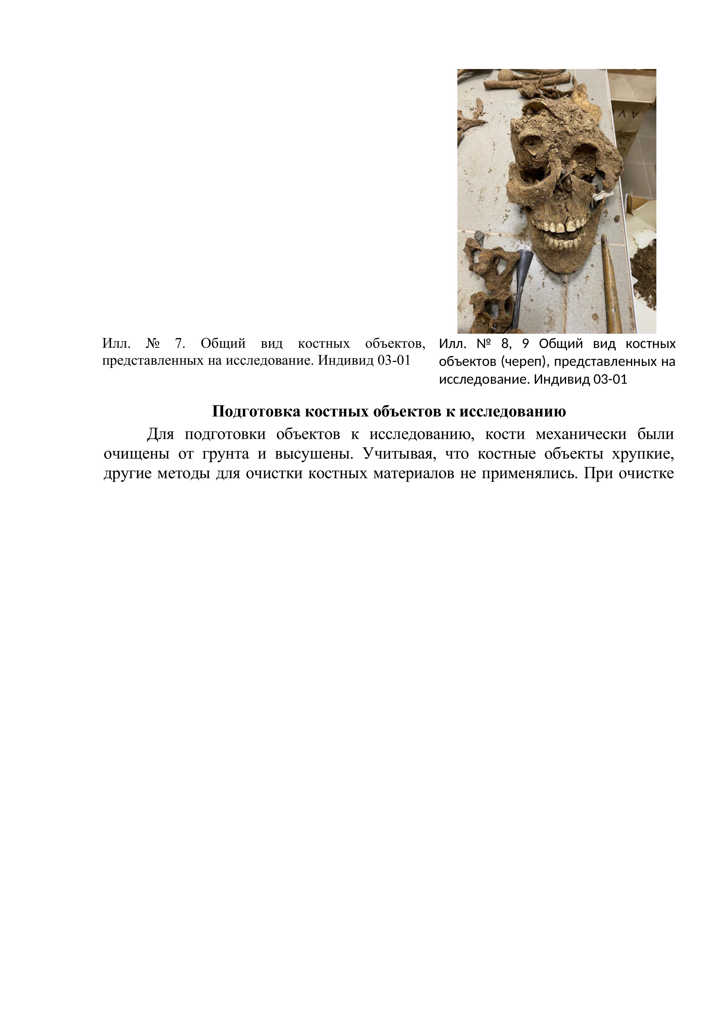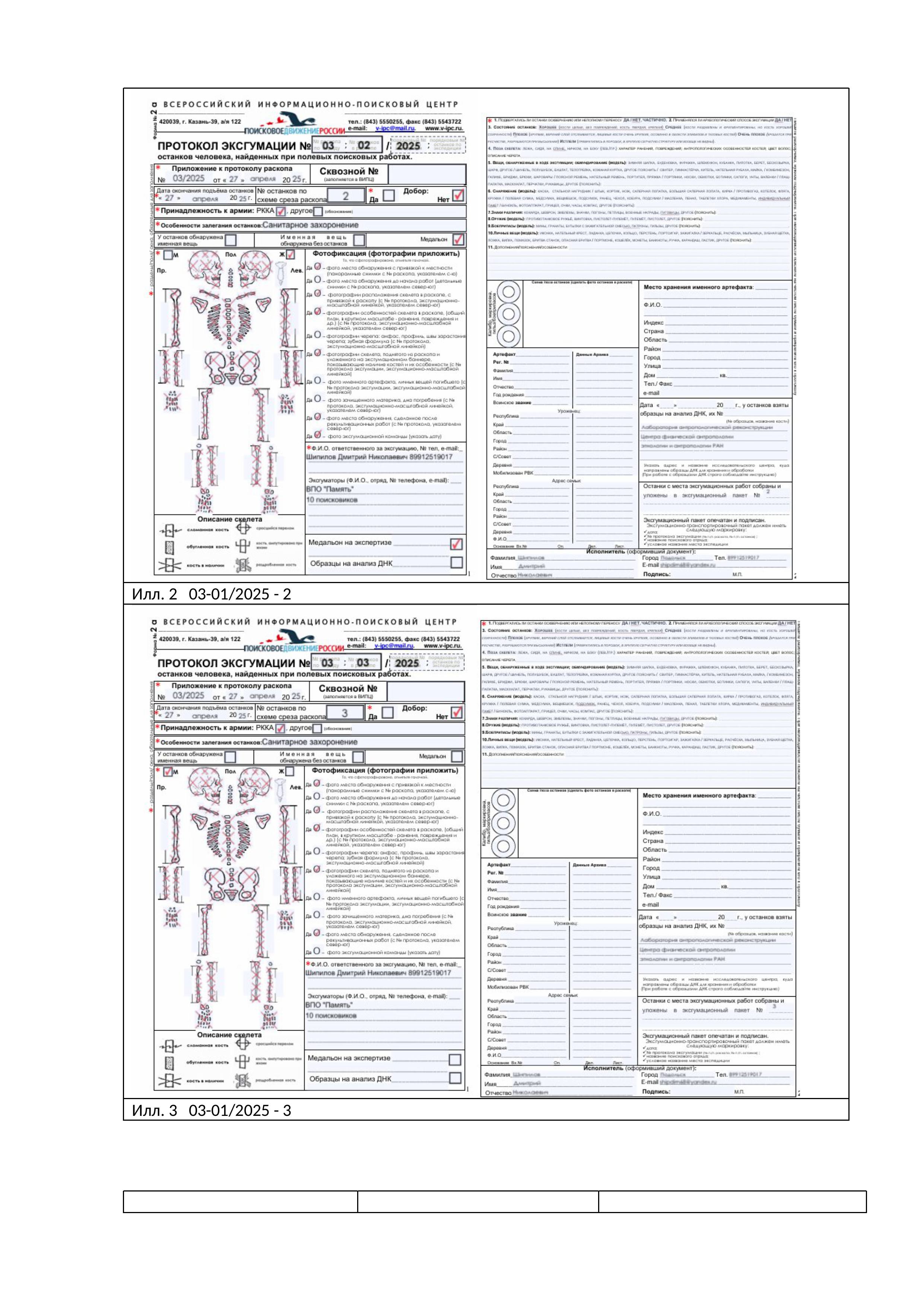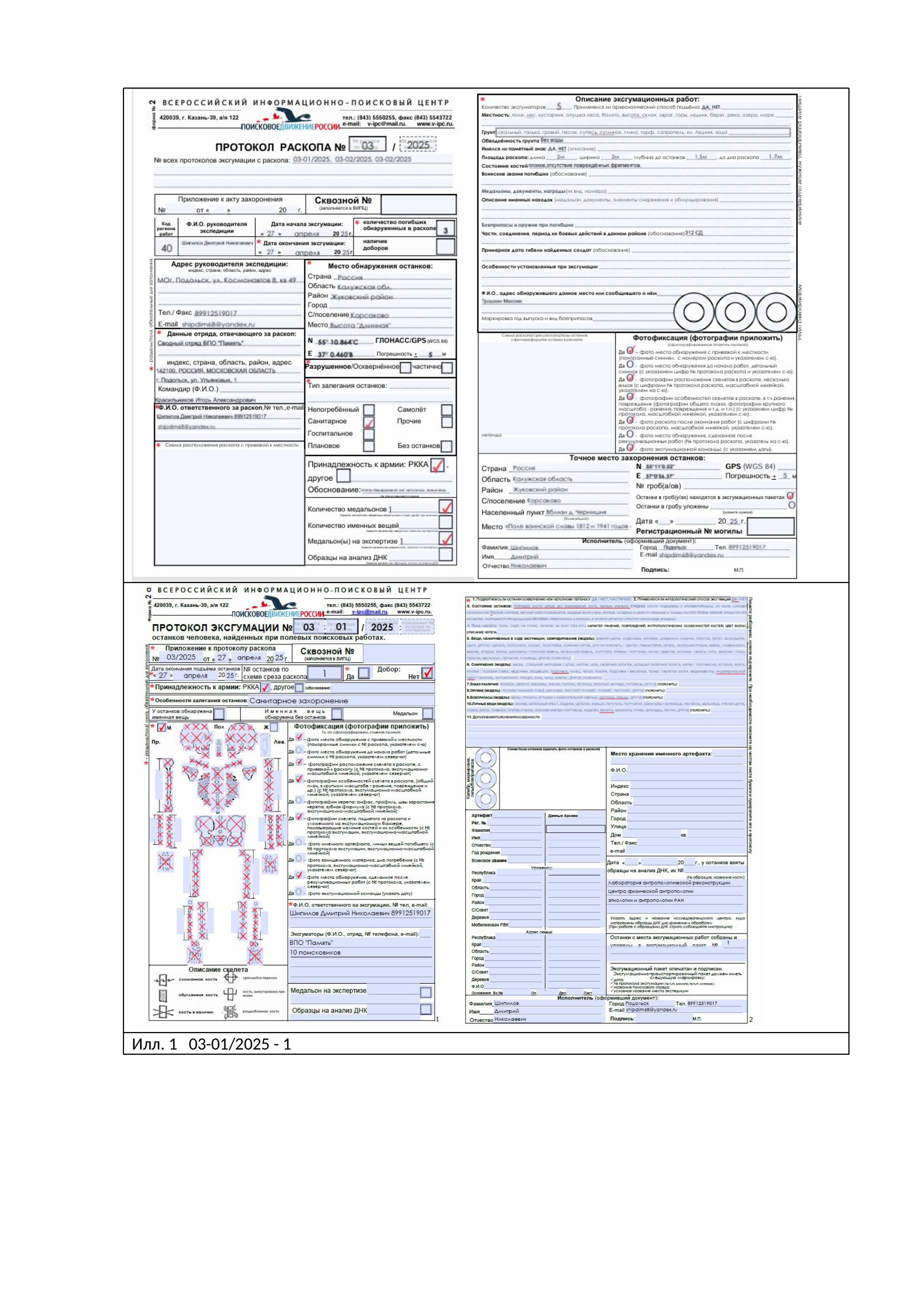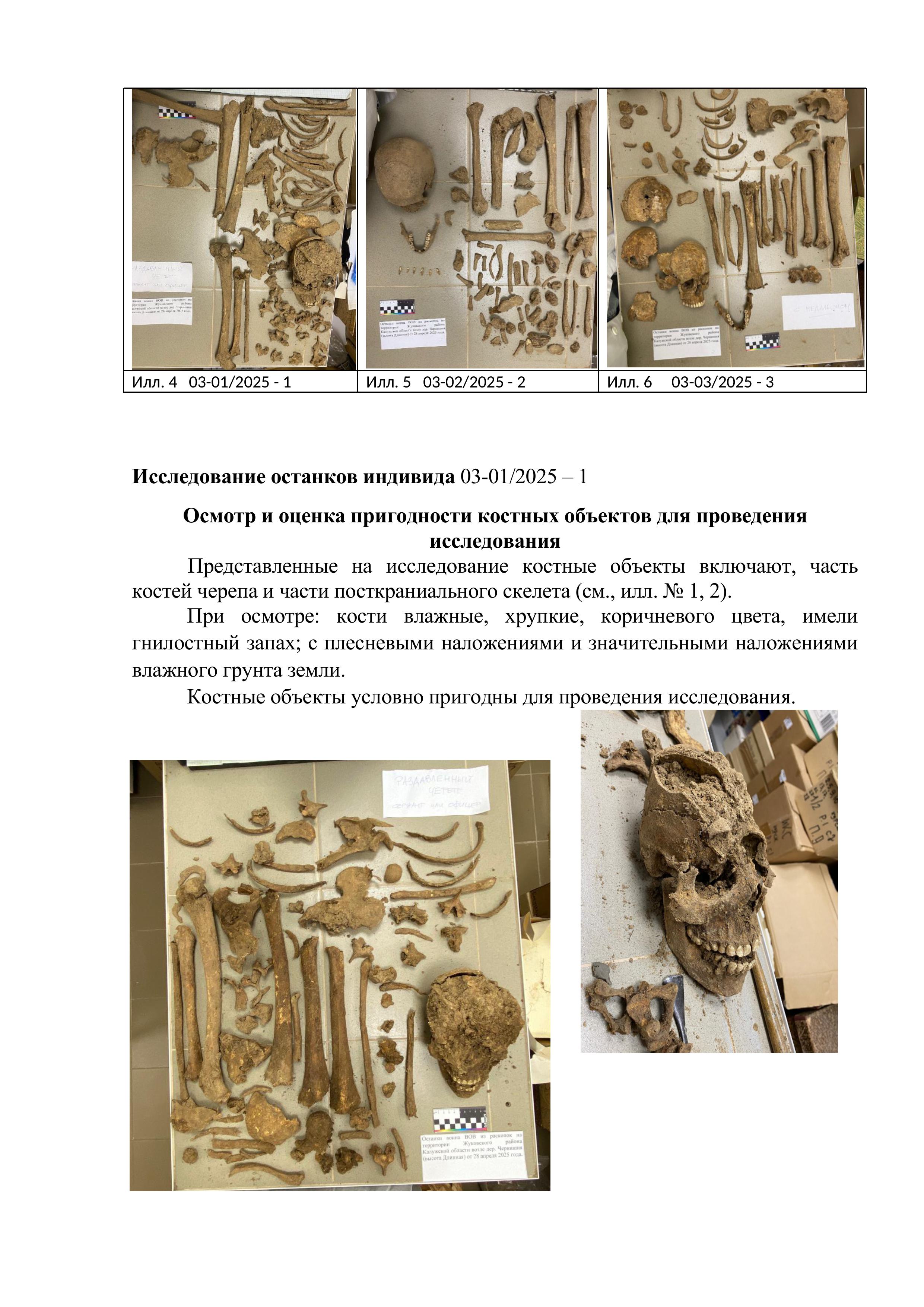 На исследование представлены протоколы эксгумации: 03-01/2025, 03-02/2025, 03-03/2025 (илл. 1, 2, 3) и костные объекты включающие, часть костей черепа и части посткраниального скелета (илл. 4, 5, 6).