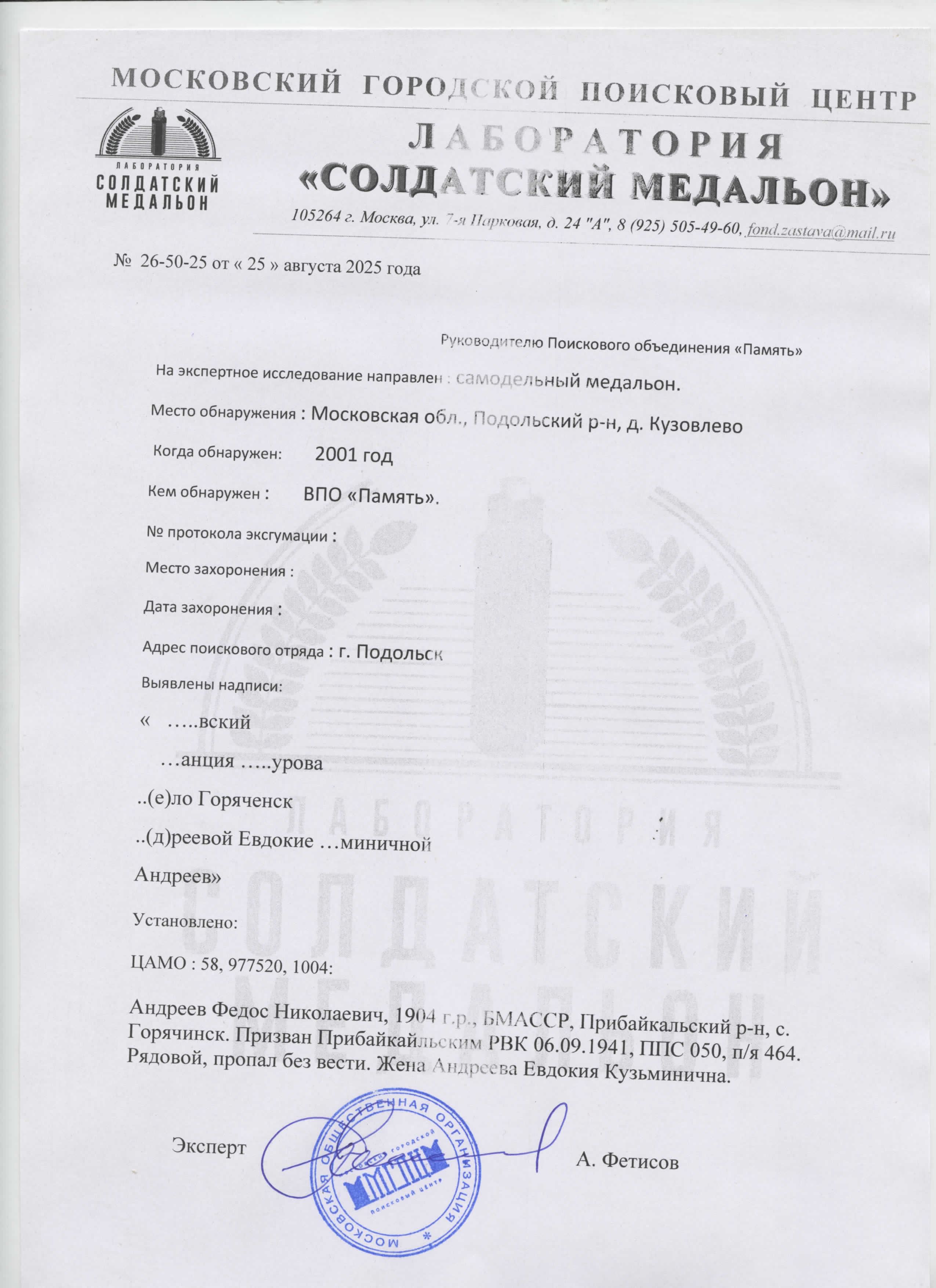 В палаточном лагере командиром объединения Красильниковым И. А. медальон был вскрыт. Вкладыш оказался нестандартным и при изъятии она расползалась, хотя он был заполнен карандашом. Из фрагментов оставшихся от медальона отчитать солдата не удалось. Но фрагменты мы хранили всё-равно и надеялись не на чудо, а на прогресс науки. Что и произошло в августе этого года. В очередной раз отдали старые медальоны на экспертизу. И вот удача - один медальон прочитался: